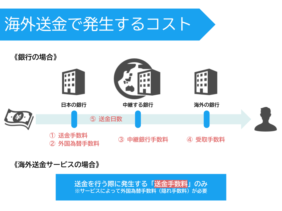 銀行送金では、受取銀行手数料および中継銀行手数料が発生するのが特徴です。