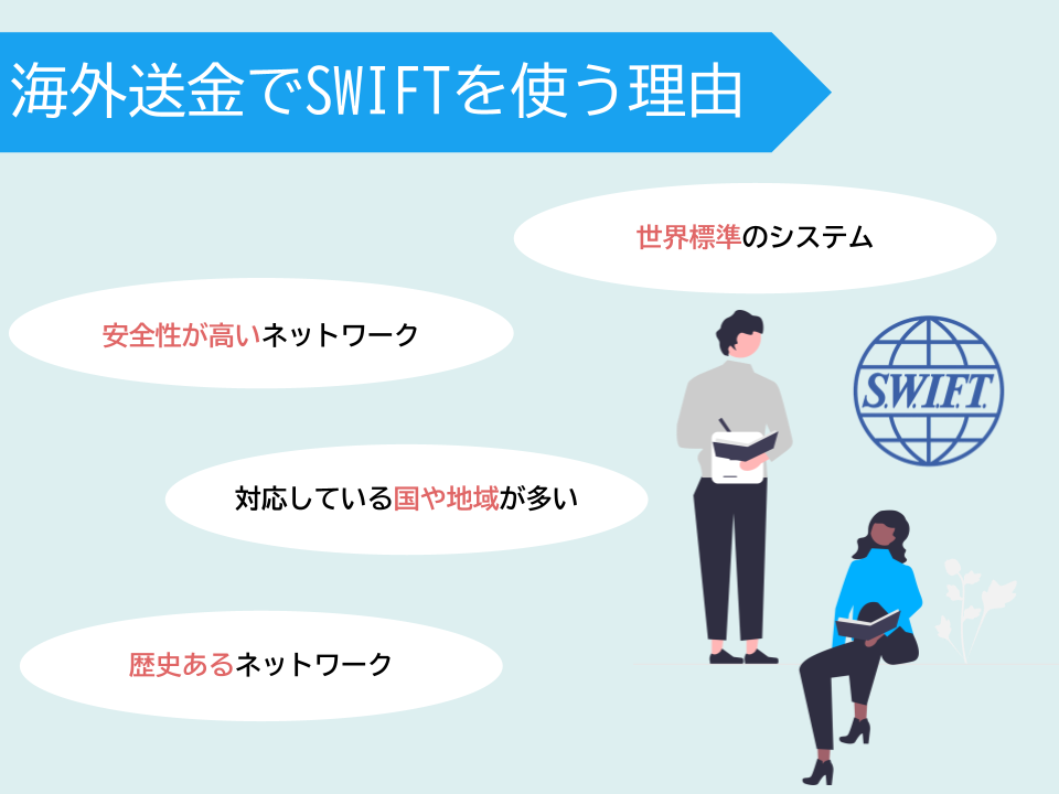 また、信用機関である銀行を利用したネットワークであることから安全性も担保されていることもSWIFTが選ばれる理由として挙げられます。