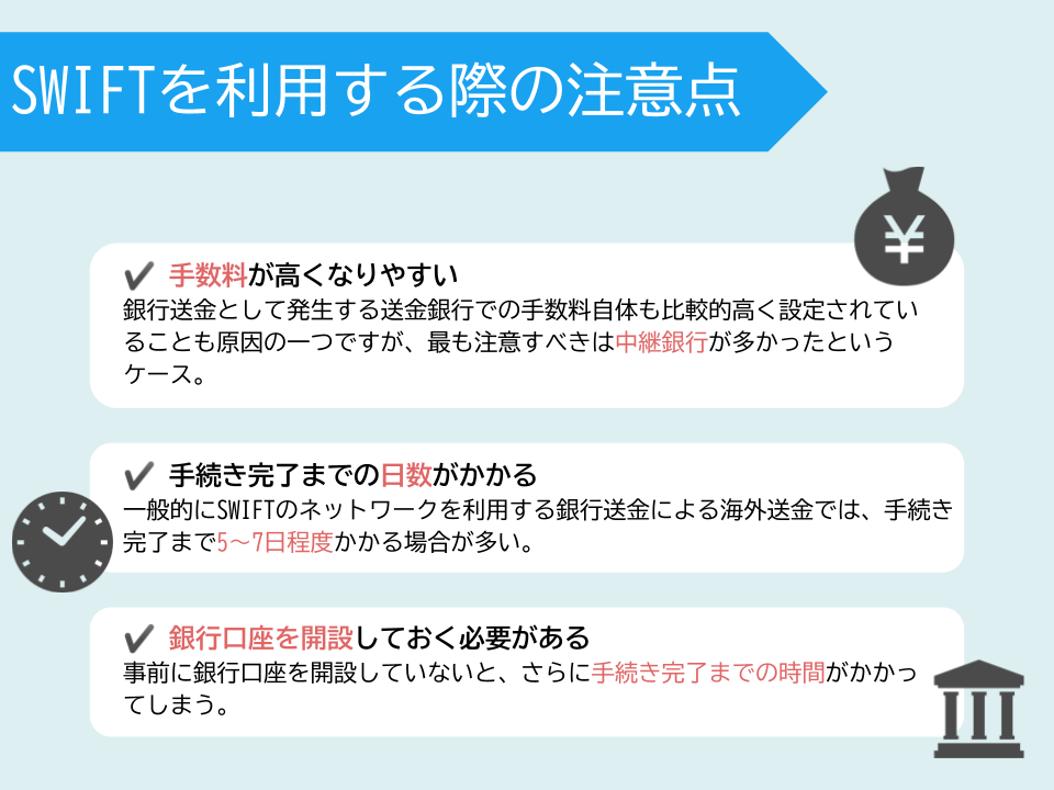 しかし、SWIFTを利用した送金を選択した場合には、いくつか注意しなければならないポイントがあるのが事実です。