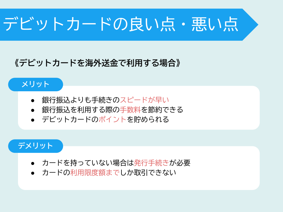 基本的には銀行送金となるとその銀行口座を開設していることや、海外送金にあたっての本人確認手続きが済んでいることが条件となります。しかし、オンライン海外送金サービスならデビットカードを持っていればそれを活用して簡単に海外送金手続きを済ませることができます。