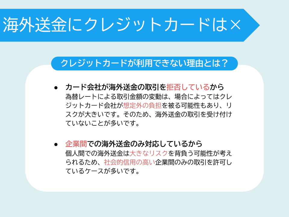 オンライン海外送金サービスの中には、デビットカードやクレジットカードとサービスを紐づけることができるものがあり、そのサービスを利用すればクレジットカード決済で送金が可能です。