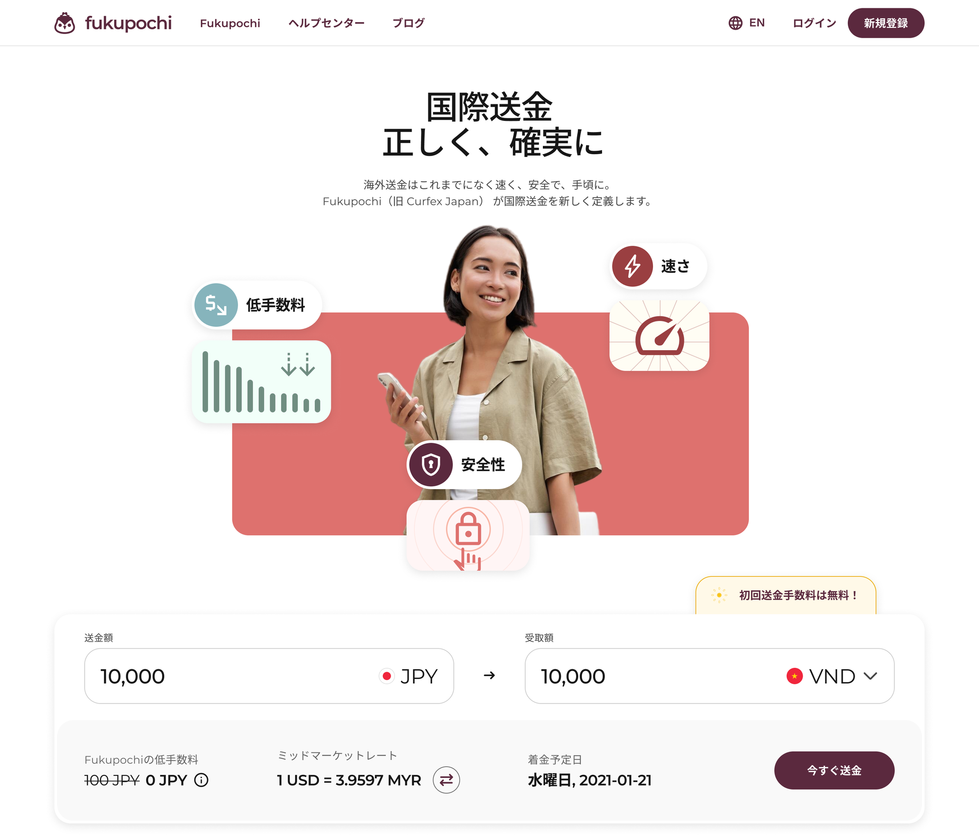 近年利用者が急増しているオンライン海外送金サービスの一つであるFukupochiは、金融庁の認可がおりている安全性の高いオンライン海外送金サービスで、送金手数料の安さが大きな特徴になります。